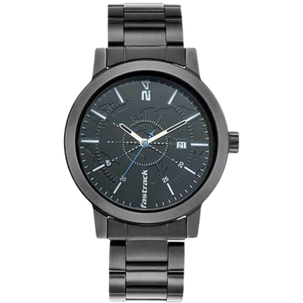 Shop Fastrack Tripster NR3245NM01 Men’s Watch. Black dial, stainless steel strap, Arabic numerals, date display, Quartz movement, 50m water resistance.