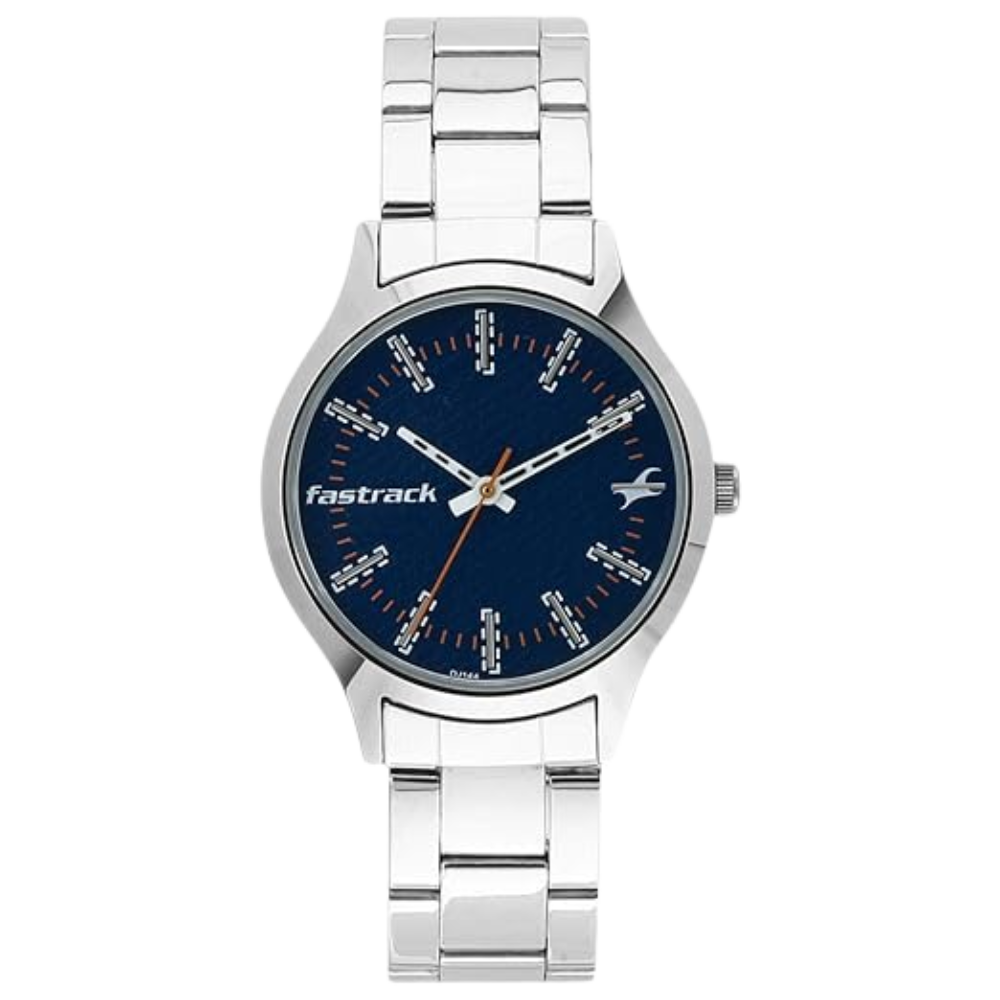 Shop Fastrack NP6180SM02 Women’s Watch. Blue dial, silver stainless steel strap, Quartz movement, 30m water resistance. Stylish & casual.