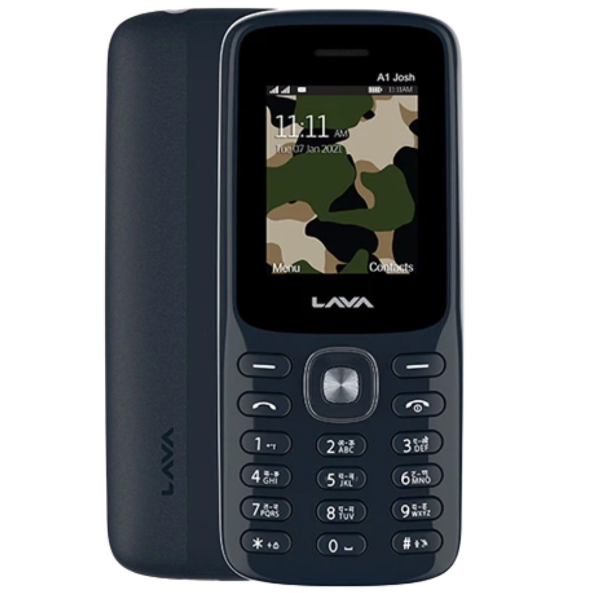 A1 Josh Lava 2G Dual SIM keypad phone with 1.8-inch TFT display, expandable memory up to 32GB, music/video player, FM radio, torch, and auto call recording.