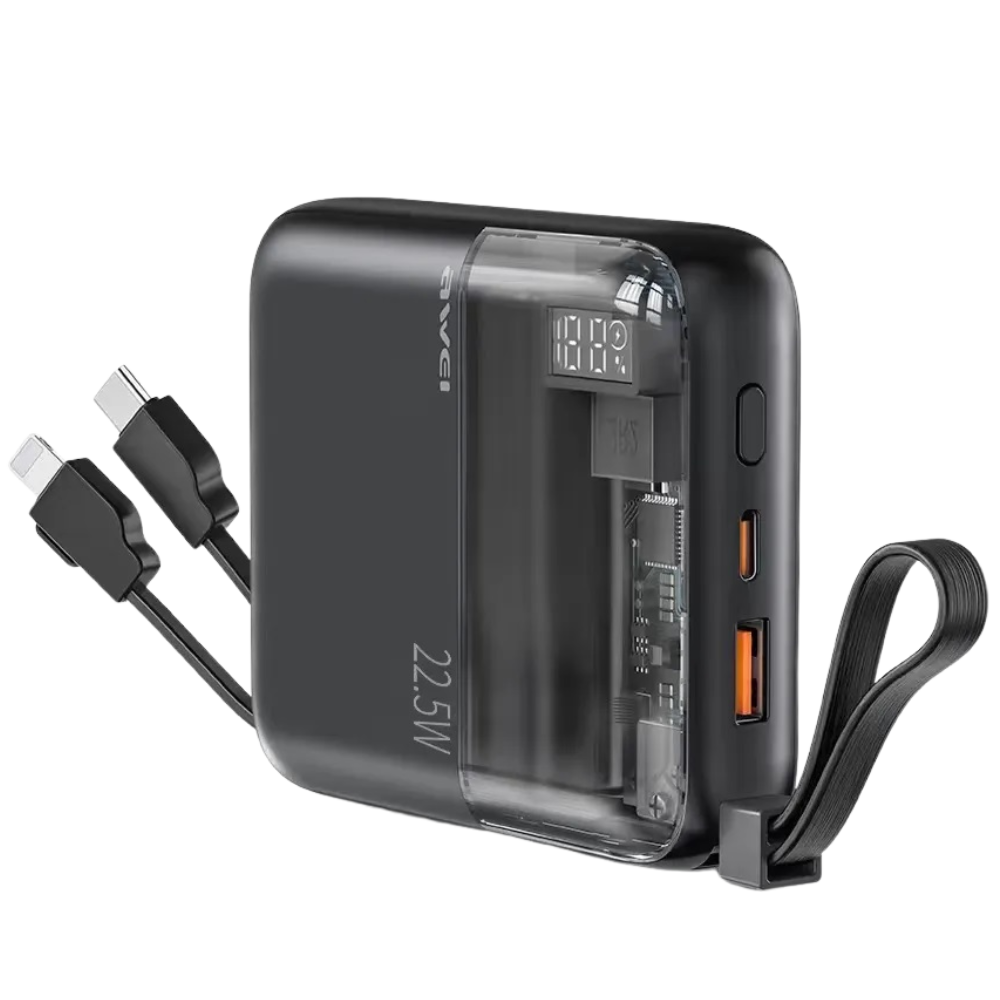 Introducing the 10,000mAh Self-Contained Dual Cable Transparent Power Bank — a stylish blend of power, design, and convenience. With a compact size of 93.08 × 79.09 × 26.25mm, this power bank is engineered to keep your devices charged anywhere while adding a unique transparent aesthetic that showcases its inner build. Equipped with a 22.5W fast charging capacity, it ensures your devices get powered quickly and efficiently.