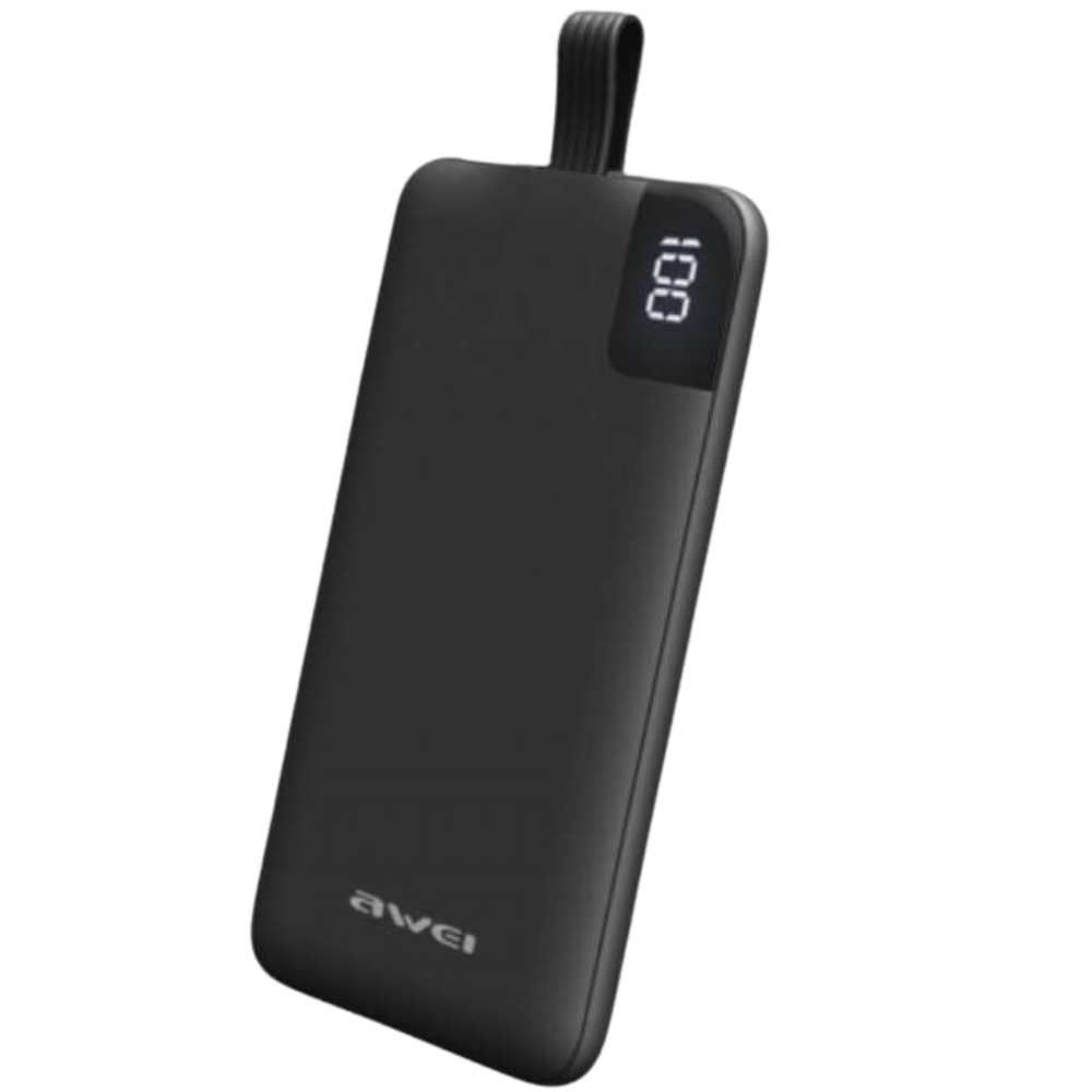 AWEI P67K 10000mAh Power Bank with dual USB ports, built-in Lightning cable, smart digital display & safe fast charging. Perfect for travel & daily use.