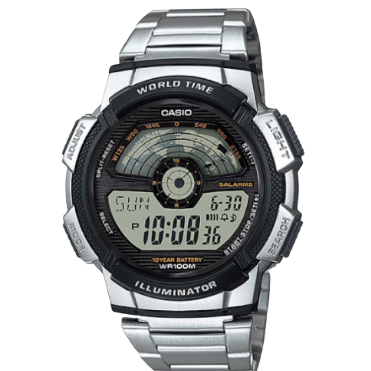 Elevate your timekeeping with this 100-meter water-resistant stainless steel digital sports watch, crafted with a resin case and bezel for durability and a sleek stainless steel band with one-touch 3-fold clasp for comfort and style. The resin spherical glass protects the display, while the LED backlight with selectable illumination (1.5s/3s) and afterglow ensures visibility in any light. Stay connected worldwide with multi-time (4 cities) and world time covering 31 zones and 48 cities. Perfect for athletes and travelers, it features a 1/100-second stopwatch, 24-hour countdown timer, 5 independent alarms, and an hourly signal. The full auto-calendar runs until 2099, with a 12/24-hour format and button tone on/off option. Powered by a 10-year battery (CR2025) with ±30 sec/month accuracy, this watch blends sporty toughness, precision timing, and everyday versatility. Ideal for men’s fashion, outdoor sports, and travel adventures.