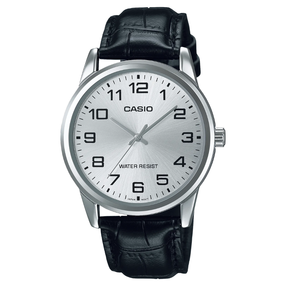 This sophisticated analog watch combines a stainless steel case with a genuine leather strap for a timeless look. Quartz movement provides accurate timekeeping within ±20 seconds per month. Featuring a black dial with mineral crystal protection and 30M water resistance, it is perfect for both casual and formal daily wear.