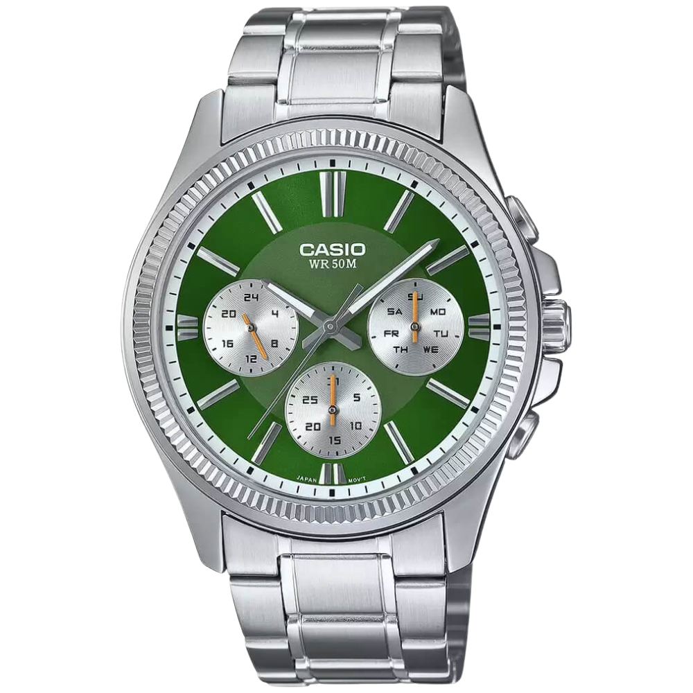 The Casio MTP-1375D-3AVDF features a refined green dial with multifunction sub-dials for day, date, and 24-hour time. Built with an ion-plated case, stainless-steel band, mineral glass, and 50m water resistance, it is both durable and stylish. The Japan Movement ensures reliable and accurate performance daily.