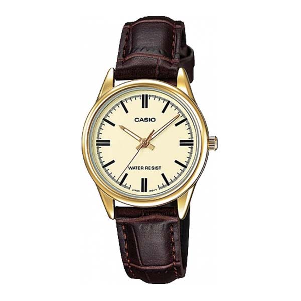 Refined, radiant, and remarkably lightweight — the Casio LTP-V005GL-9AUDF brings effortless elegance to every moment. Designed with a gold ion-plated case and a coffee-brown genuine leather strap, this timepiece perfectly balances luxury and simplicity. Its golden dial glows with understated sophistication, while Casio’s renowned precision quartz movement ensures accurate timekeeping day after day. With a slim 7.5 mm profile and a lightweight 26 g body, this watch feels as graceful as it looks — ideal for both daily wear and special occasions.