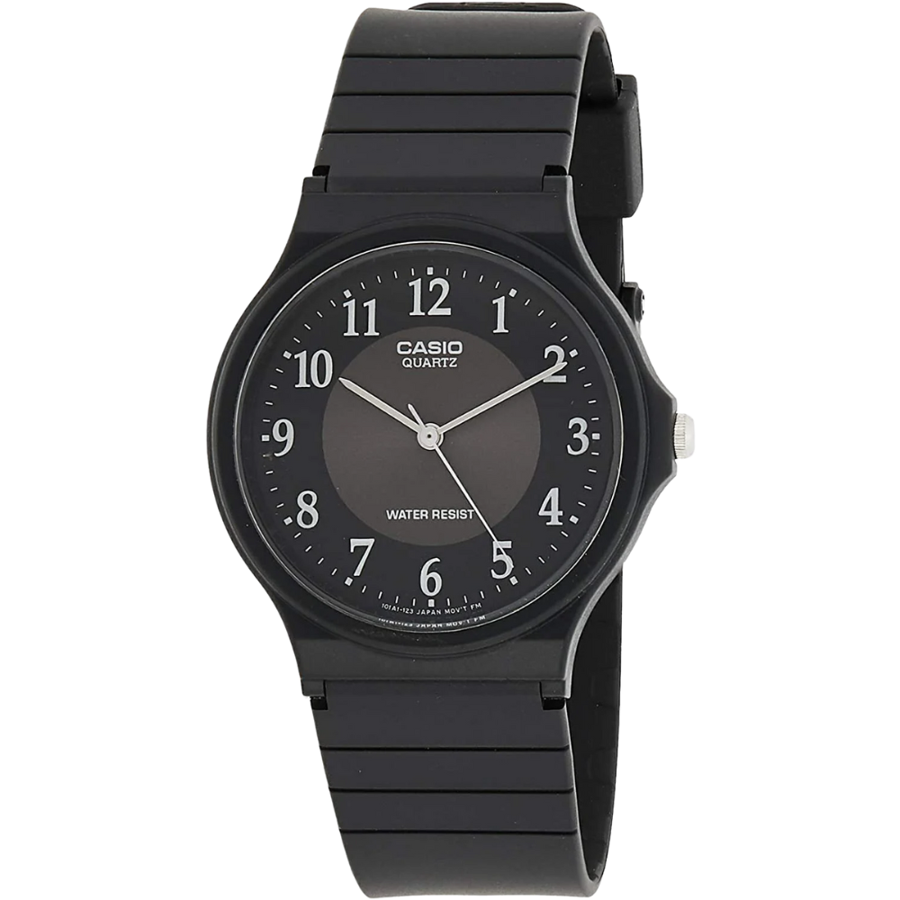 The Casio MQ-24-1B3LDF is a stylish and functional analog watch designed for daily wear. Featuring a classic round shape, black resin case, and band, this watch offers a comfortable and lightweight fit at just 20 grams. The minimalist black dial complements both casual and formal outfits, making it a versatile accessory for any occasion.