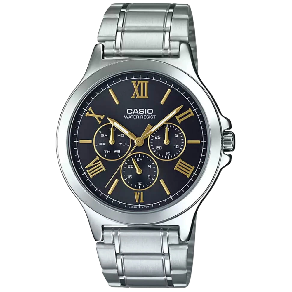Casio MTP-V300D-1A2UDF is a refined men’s analog watch featuring date, day, and 24-hour indicators. Built with a durable ion-plated case, mineral glass, and stainless steel band, it delivers reliable Japanese movement accuracy. With water resistance and a 3-year battery life, this watch is ideal for everyday and formal use.