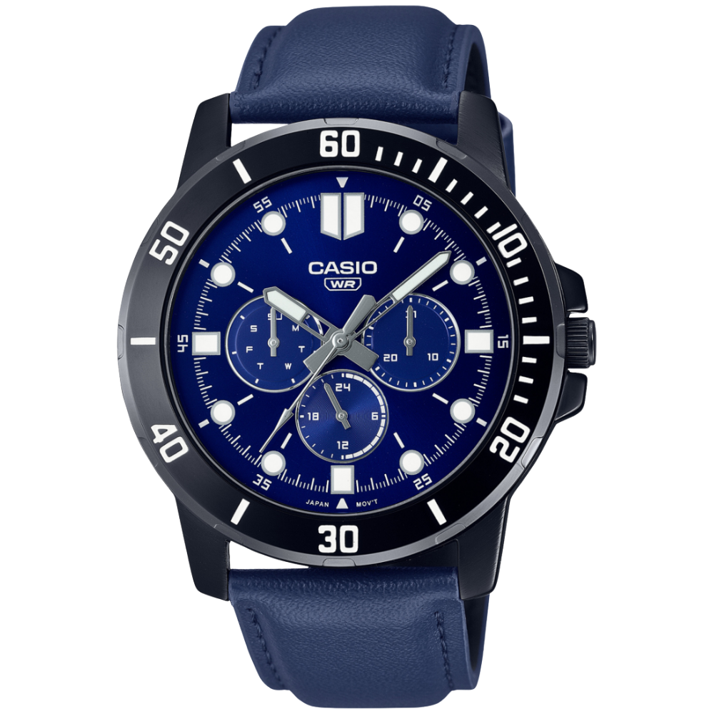 The Casio MTP-VD300BL-2EUDF is a multifunctional men’s watch featuring day, date, and 24-hour sub-dials. Built with a black ion-plated case, mineral glass, and synthetic leather band, it delivers durability, quartz accuracy, and stylish everyday performance in a comfortable and lightweight design.