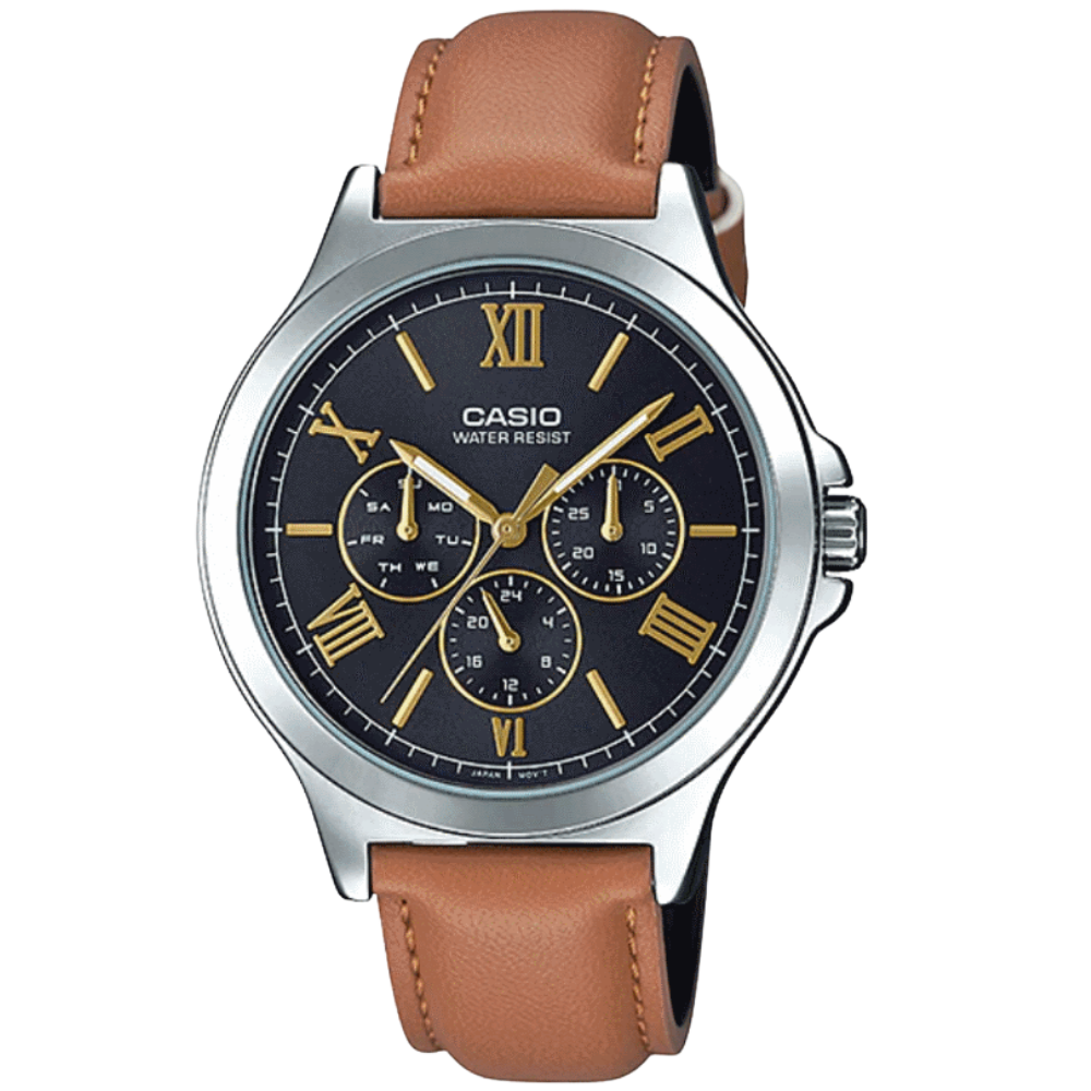 The Casio MTP-V300L-1A3UDF is a multifunctional men’s watch featuring day, date, and 24-hour sub-dials. Built with an ion-plated case, mineral glass, and synthetic leather band, it offers durability, comfort, and accurate quartz performance—making it a stylish and reliable choice for everyday wear.