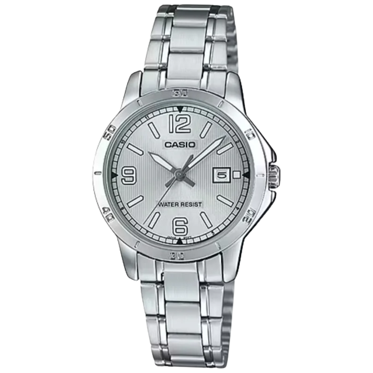 The Casio Women’s Stainless Steel Analog Watch delivers a clean, simple, easy-to-use design perfect for women who value elegance in everyday wear. Built with a durable ion-plated case and scratch-resistant mineral glass, this watch maintains clarity and shine through daily use. The stainless-steel band paired with a triple-fold clasp ensures a secure and comfortable fit for all-day wear. Powered by reliable Japan Movement, it offers precise timekeeping with ±20 seconds per month accuracy. A convenient date display adds practical functionality, while the slim 7.8 mm profile and lightweight 56 g construction enhance comfort. With a long-lasting 3-year battery life and water-resistant build, this watch stands out as a dependable choice for office wear, regular use, or minimal fashion styling.