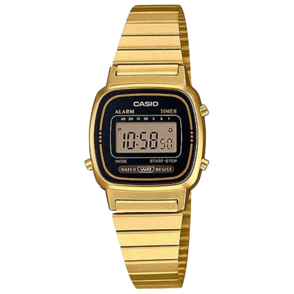 The Casio LA670WGA-1DF is a classic retro women’s digital watch featuring a gold-tone resin case, stainless steel band, and multiple everyday functions. With stopwatch, countdown timer, daily alarm, calendar, and water resistance, this lightweight 27.8 g timepiece blends vintage elegance with modern practicality.