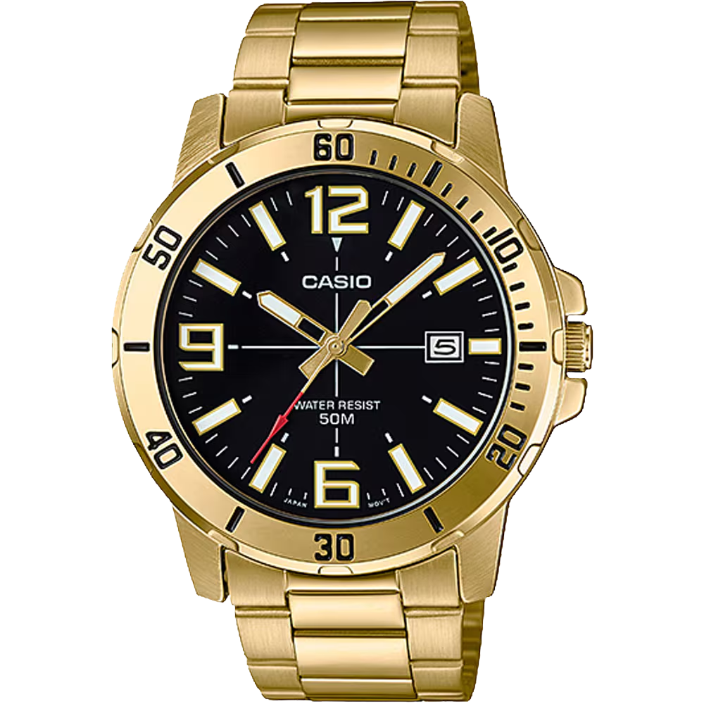 The Casio MTP-VD01G-1BVUDF is a premium men’s analog watch featuring a gold ion-plated case and band, mineral glass, and a clear date display. With 50-meter water resistance, reliable quartz accuracy, and a solid 118 g build, it delivers luxurious style with dependable everyday performance.