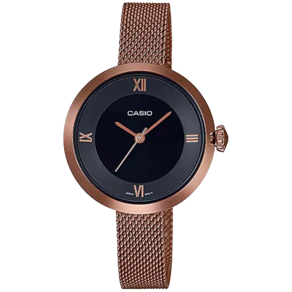 The Casio LTP-E154MR-1ADF Women’s Watch combines elegance with precision. Featuring a black dial, rose gold stainless steel mesh band, mineral glass, and quartz movement, it’s perfect for both casual and formal occasions. Enjoy comfort, durability, and timeless design with a 3-year battery life and ±20 seconds monthly accuracy.
