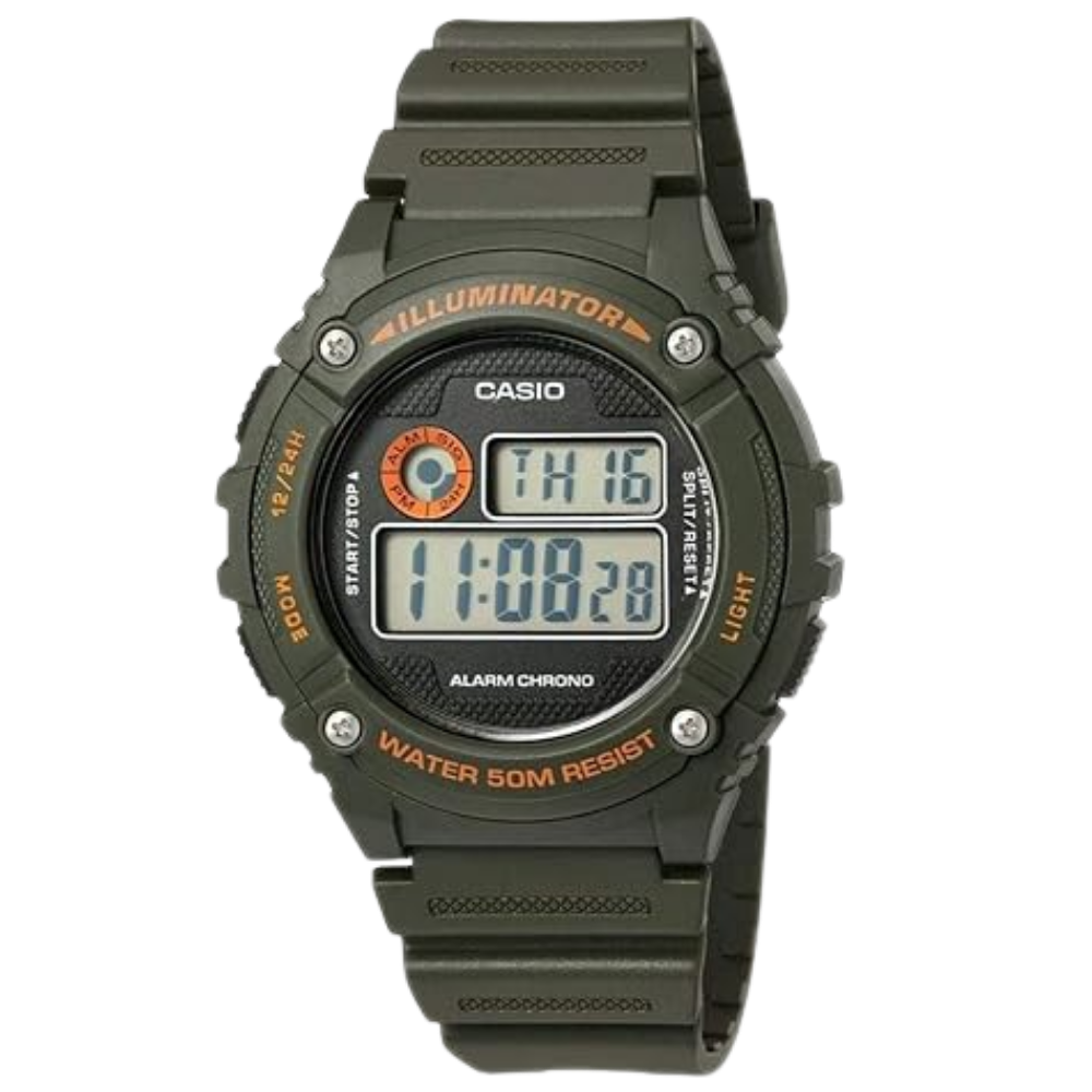 Casio Youth W-216H-3BVDF delivers reliable digital performance with a rugged black dial and durable resin glass. Featuring 50-meter water resistance, LED backlight, stopwatch, daily alarm, and hourly signal, this watch is ideal for daily wear, sports, and outdoor activities, offering long-lasting accuracy, comfort, and trusted Casio durability.