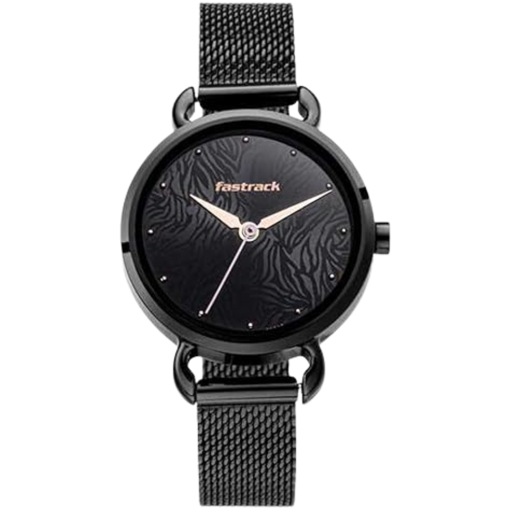 The Fastrack Animal Print 6221NM02 offers a bold black analog dial paired with a sleek stainless-steel strap. Designed for modern women, it delivers everyday comfort, durable mineral glass, and reliable quartz movement. Perfect for casual outings, parties, and stylish daily wear with a trendy fashion flair.