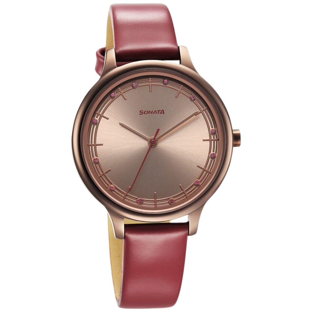 The Sonata Blush 87050QL01 features a refined brown dial complemented by a premium leather strap, offering a soft yet elegant look for women. Powered by a reliable quartz movement and lithium battery, this lightweight analog watch ensures daily comfort, precision, and effortless style for any occasion.