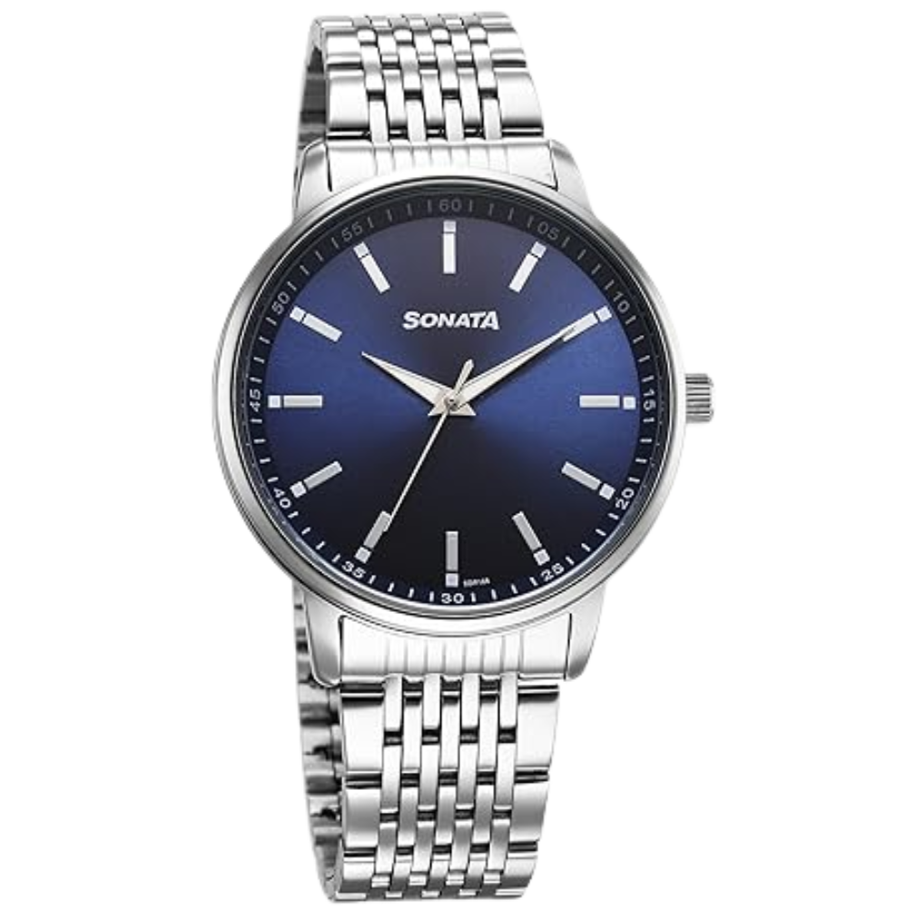 The Sonata 77156SM01 features a striking blue dial complemented by a polished silver metal strap, creating a refined festive look. Built with a durable metal case, mineral glass, and a push-button deployment clasp, this analog men’s watch offers comfort, durability, and timeless elegance for daily or special-occasion wear.