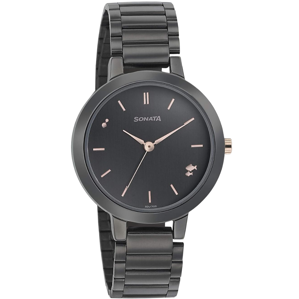 The Sonata Play 8141KM03 features a sophisticated anthracite dial paired with a sleek black stainless-steel strap. Designed for modern women, this quartz analog watch offers precision, durability, and everyday elegance. With a lightweight build and included lithium battery, it ensures long-lasting performance and refined style for any occasion.