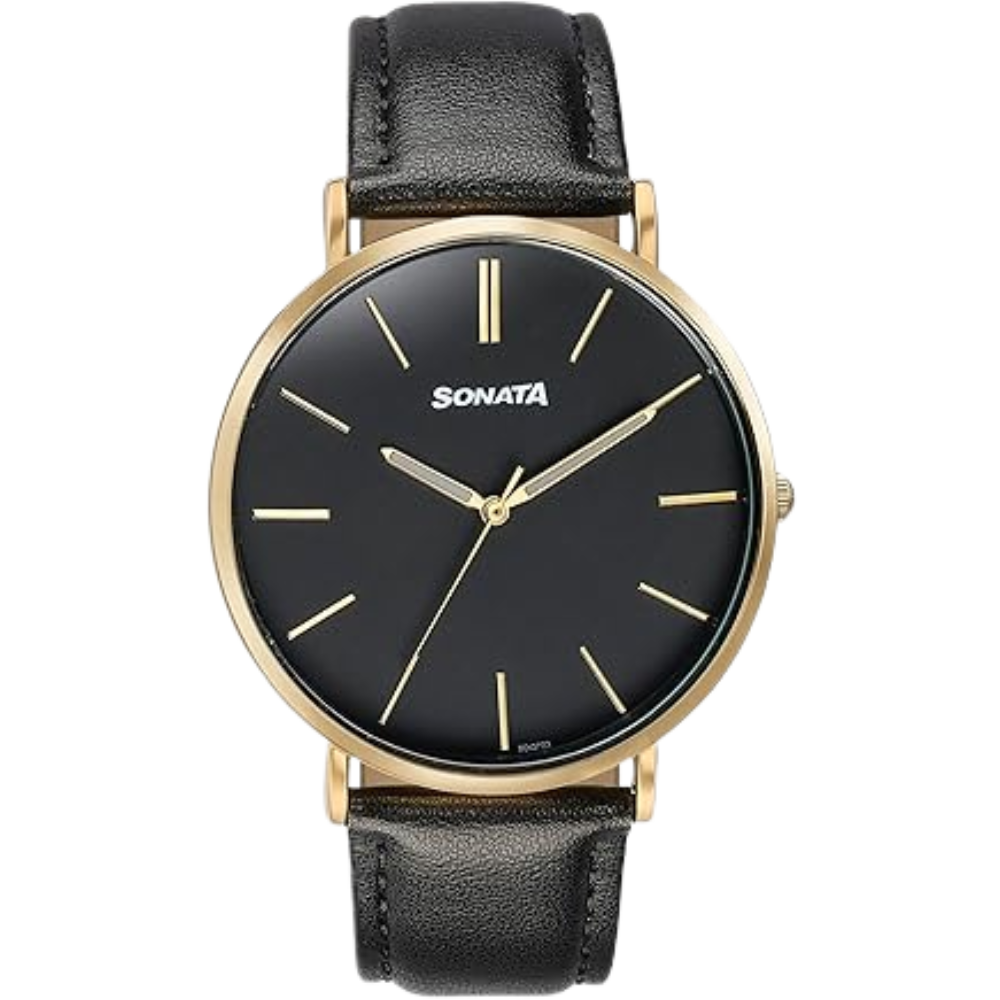 The Sonata 77143YL02 brings a stylish black dial with a matching black leather strap, delivering a premium classic look. Its slim 7 mm alloy-steel case and mineral glass offer durability, while the lightweight design ensures comfortable daily wear. Perfect for men seeking elegance, simplicity, and timeless appeal.