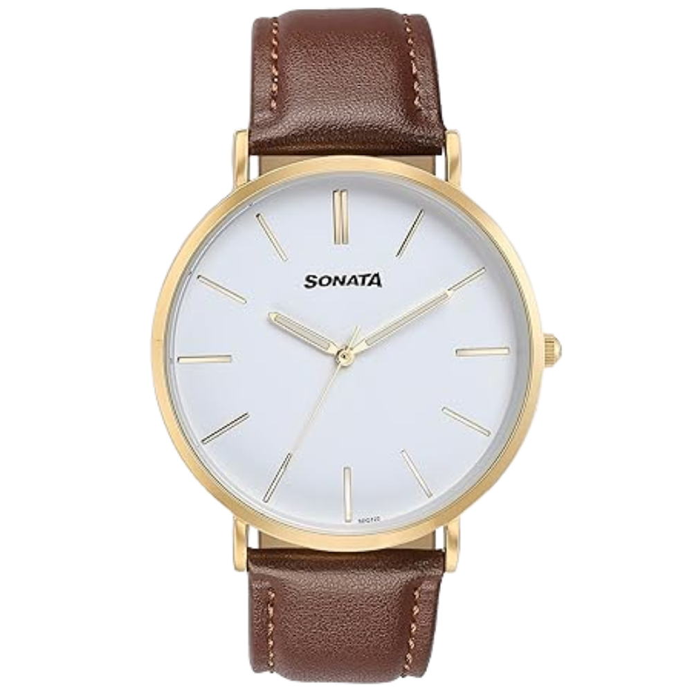 The Sonata 77143YL01 offers a refined white dial with a premium brown leather strap, giving a timeless classic look. Its slim 7 mm alloy-steel case, mineral glass, and lightweight build make it ideal for all-day comfort. A perfect choice for men seeking sophistication and simplicity in one watch.