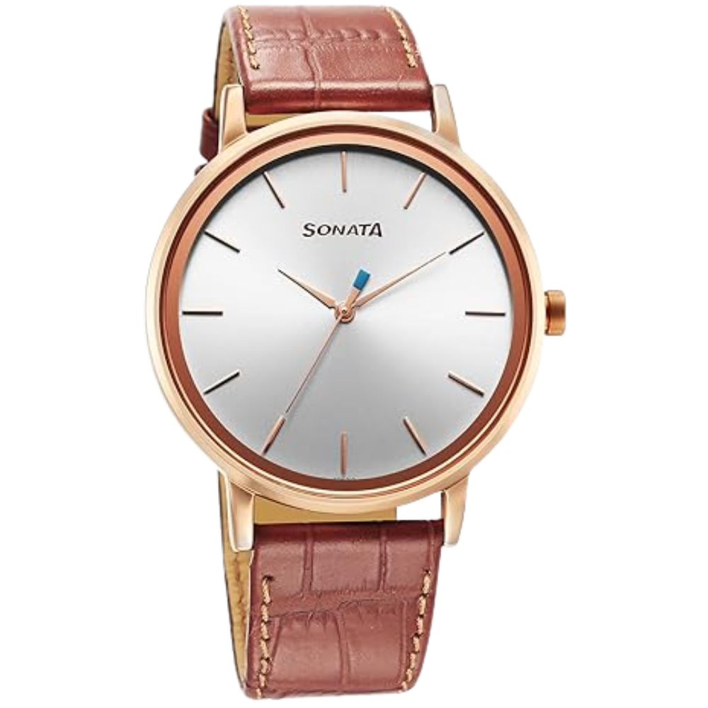 The Sonata Utsav 7131WL04 features a refined silver dial complemented by a premium brown leather strap, creating a timeless festive look. With a bold brass case, mineral glass, and smooth quartz analog movement, this lightweight men’s watch offers style, comfort, and durability for daily use and special occasions.