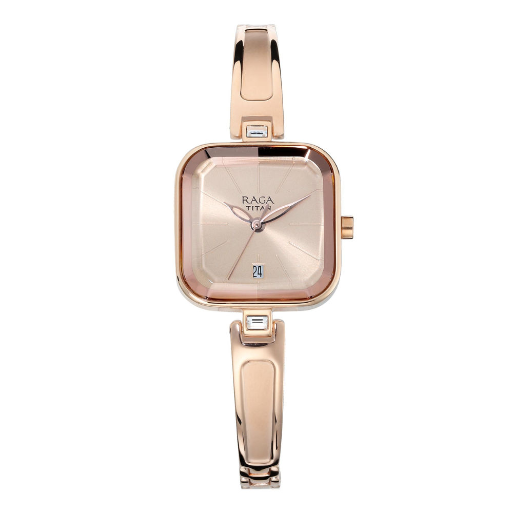 Crafted for women who love timeless beauty, the Titan Raga Viva 2607WM01 blends classic charm with modern refinement. With its rose-gold glow, sleek metal strap, and beautifully detailed dial, this watch enhances your look effortlessly—whether you're dressing for work, a special event, or your everyday outings.