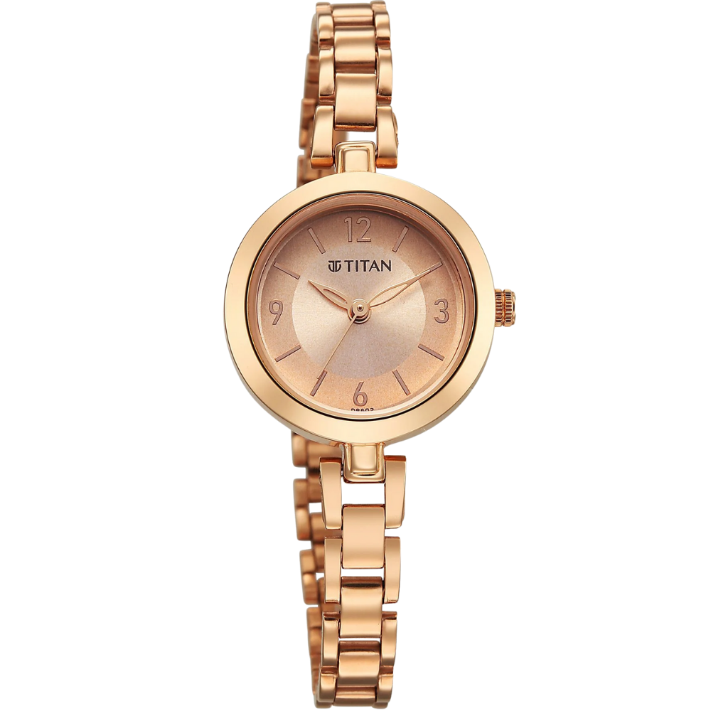 The Titan Karishma Ladies Upgrades PH1 watch features a graceful rose gold dial paired with a stainless steel rose gold strap. Its slim round case and classic analog display offer timeless elegance, making it a perfect accessory for women who appreciate style, simplicity, and everyday sophistication.