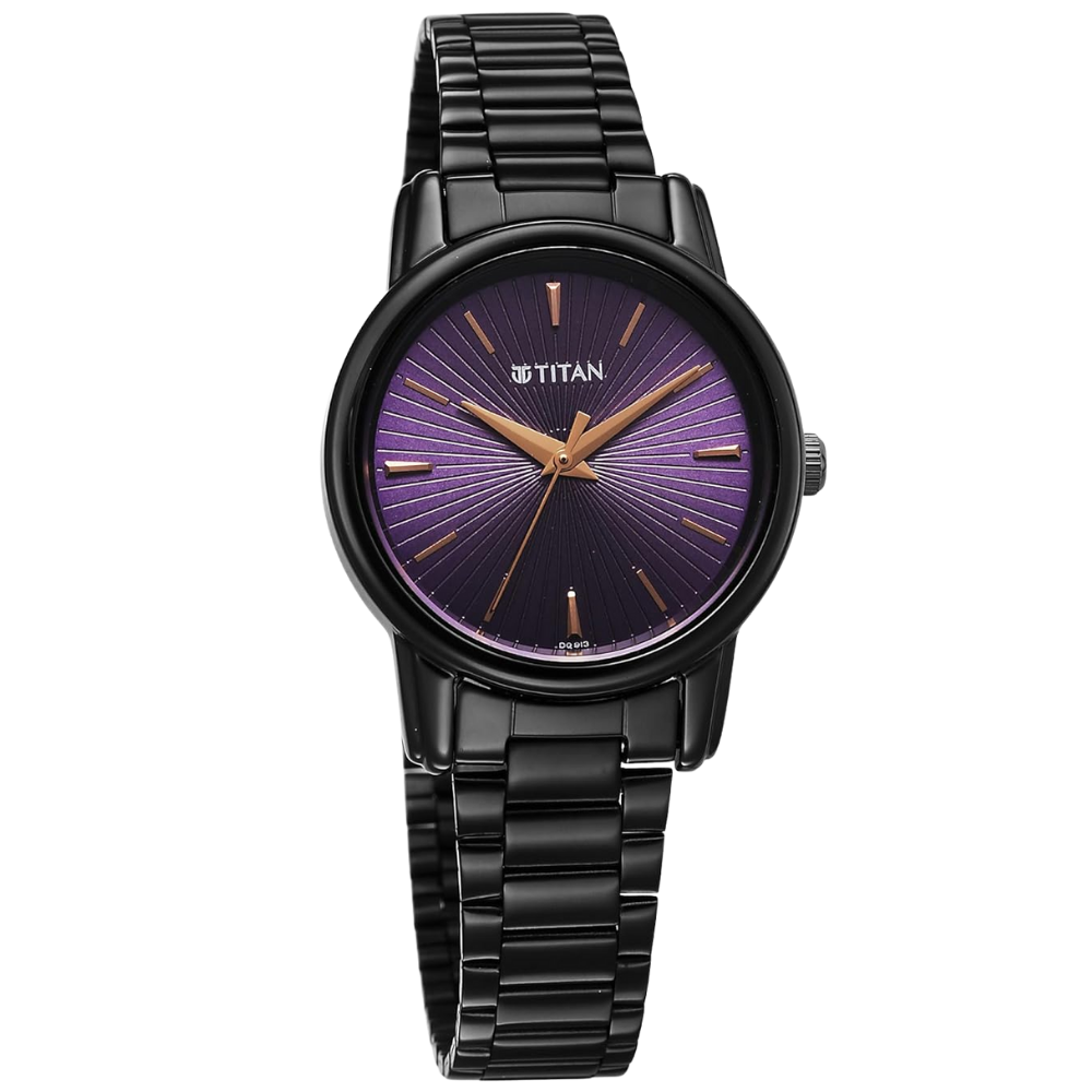 Titan Karishma Workwear 2760NM01 features a stylish purple analog dial with an attractive open dial design and precise quartz movement. Durable stainless steel strap, battery-powered reliability, and refined workwear styling make it perfect for office and daily use. Designed for women who prefer elegance with a modern touch, backed by trusted Titan quality.