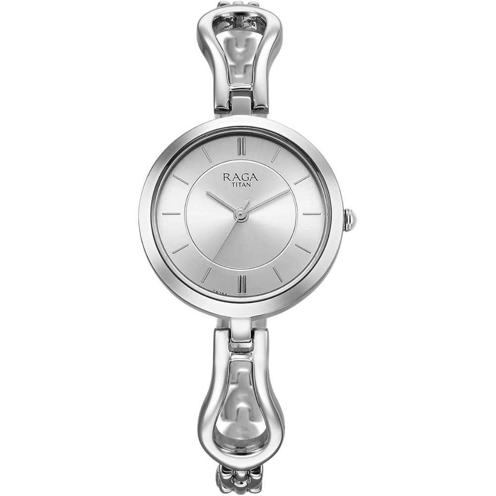 Titan Raga 2727SM01 features a refined silver analog dial with precise quartz movement and classic round design. Durable brass case and strap, mineral glass protection, and 50-meter water resistance ensure reliability. Designed for women, this elegant watch offers comfort, timeless style, and dependable performance for daily, office, and occasional wear.