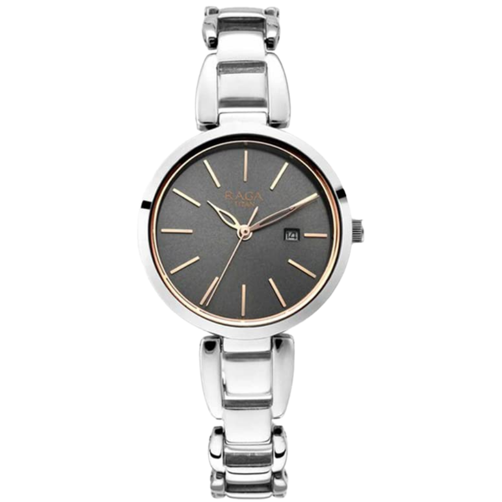 Titan Raga Viva Quartz Analog with Date Dark Grey Dial Silver Metal Strap Watch for Women -2642SM01
