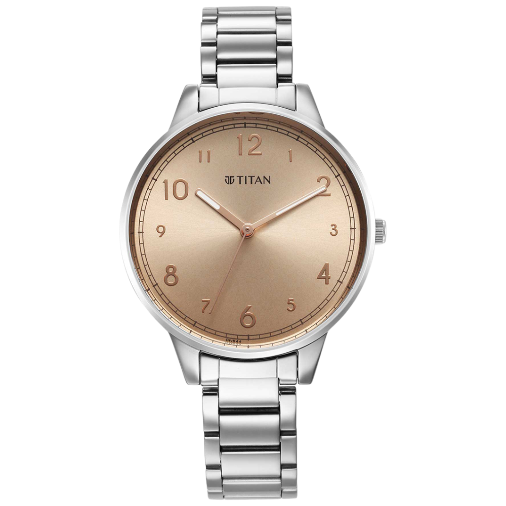 The Titan Urban 2648SM08 is a sophisticated women’s analog watch featuring a rose-gold dial, slim brass case, and a sleek silver metal strap. Powered by quartz movement and protected with mineral glass, it blends fashion and function—ideal for everyday elegance and modern style.