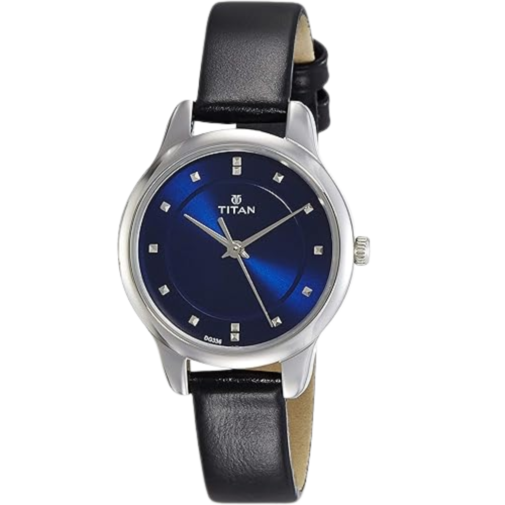 The Titan 2481SL08 features a striking blue dial paired with a sleek black leather strap. Its quartz movement ensures reliable timekeeping, while the slim metal case adds elegance. Designed for modern women, this watch is perfect for daily wear, office use, and stylish minimal fashion.