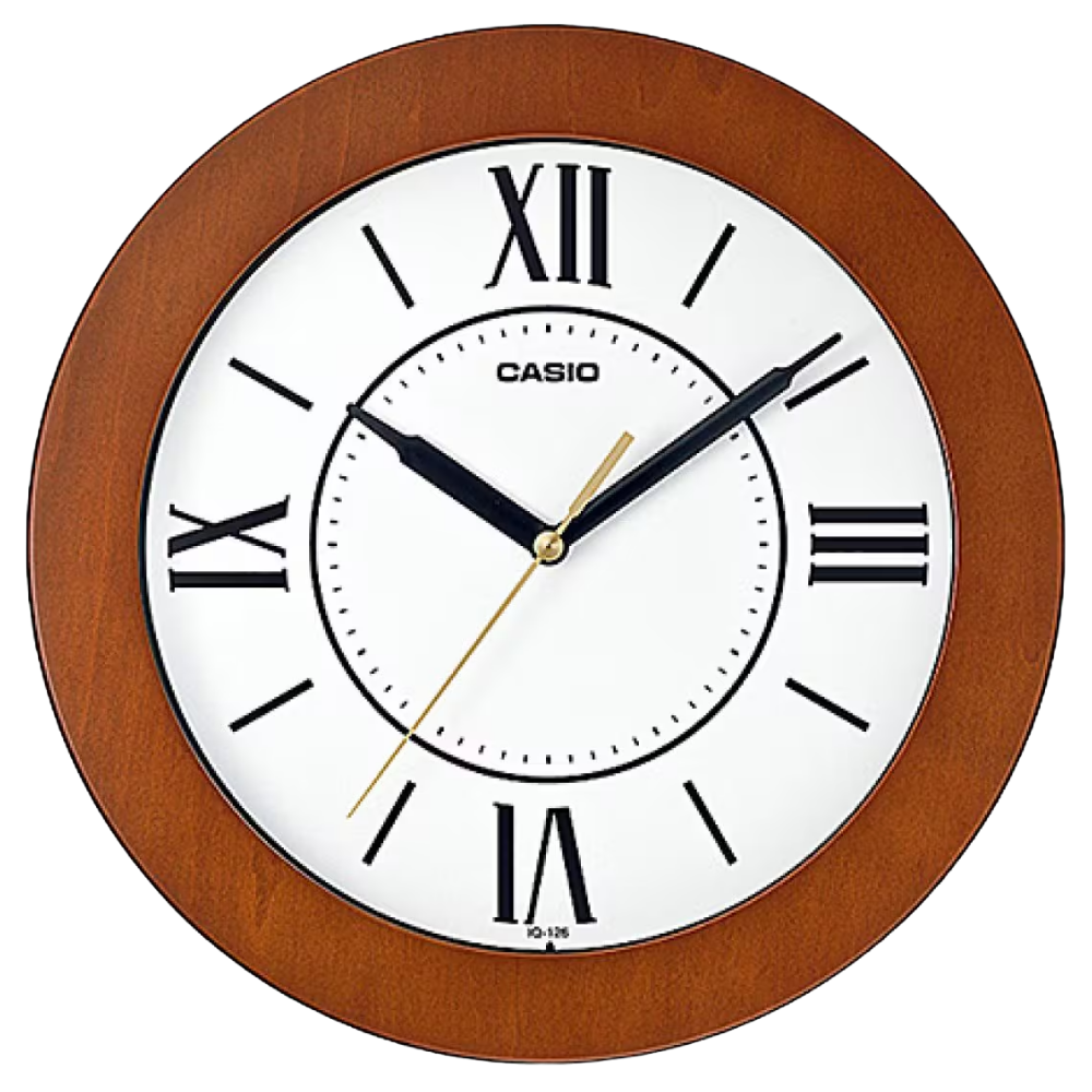 Casio Analog Wall Clock IQ 126-5BDF features a large 30cm round dial, accurate analog movement, durable resin and wood body, and reliable Casio performance for home or office use.