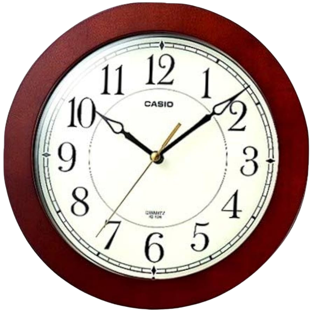 Casio Analog Wall Clock IQ 126-5DF features a classic round design, accurate analog movement, durable resin and wood body, and long-lasting battery life for home or office use.