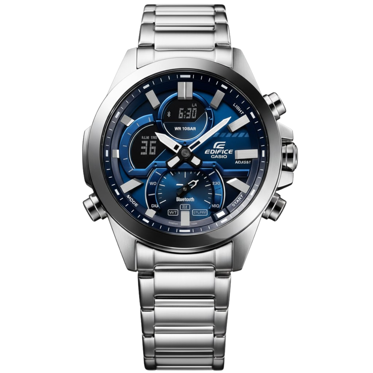 Shop the Casio EDIFICE ECB-30D-2ADF with Bluetooth smartphone link, Schedule Timer, world time, analog-digital display, LED light, and stainless-steel build. Blue dial, 100m water resistance, powerful quartz accuracy.