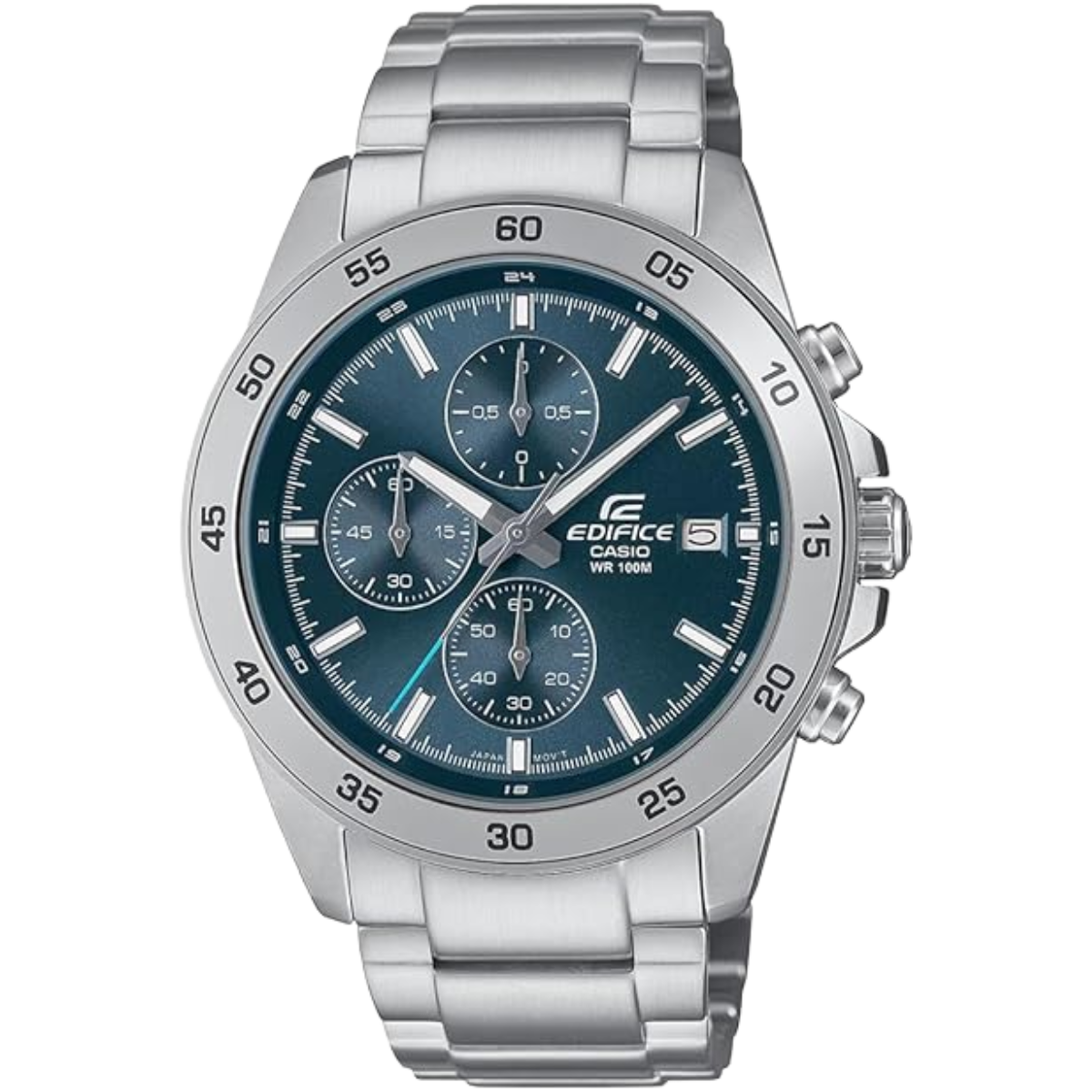 Shop the Casio Edifice Dark Blue Dial Chronograph with stainless-steel build, 100M water resistance, mineral glass, quartz movement, and 3-year battery life. A bold and luxurious watch for modern men.