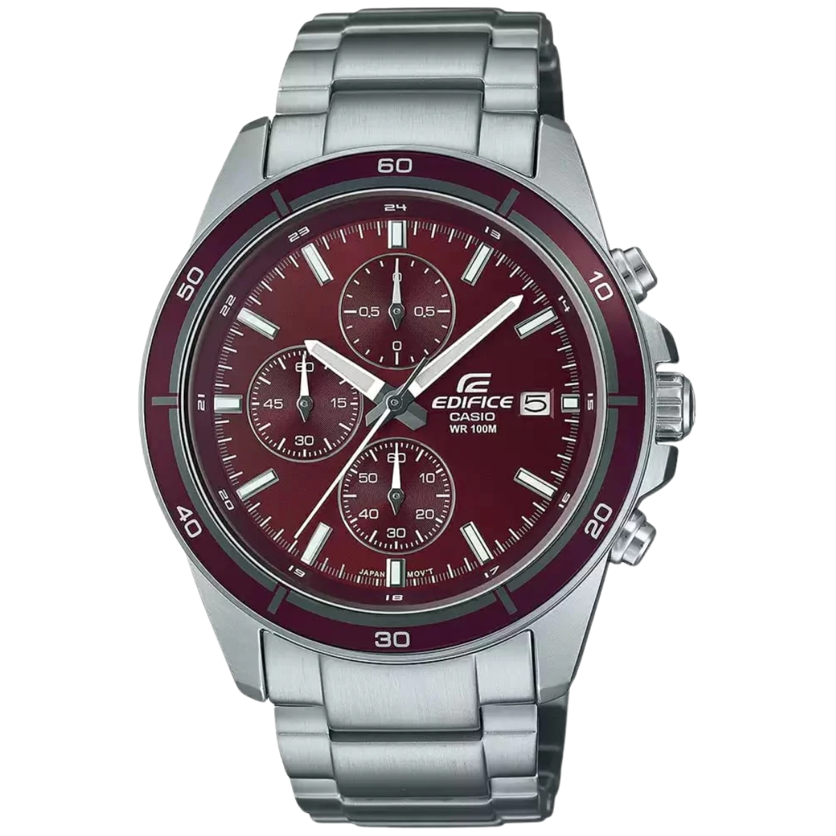 Shop the Casio Edifice Red Dial Chronograph featuring stainless steel build, tachymeter bezel, luminous hands, Quartz movement, 2-year battery life, and 100m water resistance for bold performance.
