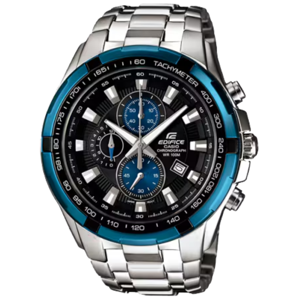 Buy the Casio Edifice Men’s Watch with black dial, stainless steel case and band, multifunction features, date display, stopwatch, quartz movement, and 100m water resistance. Stylish and durable.
