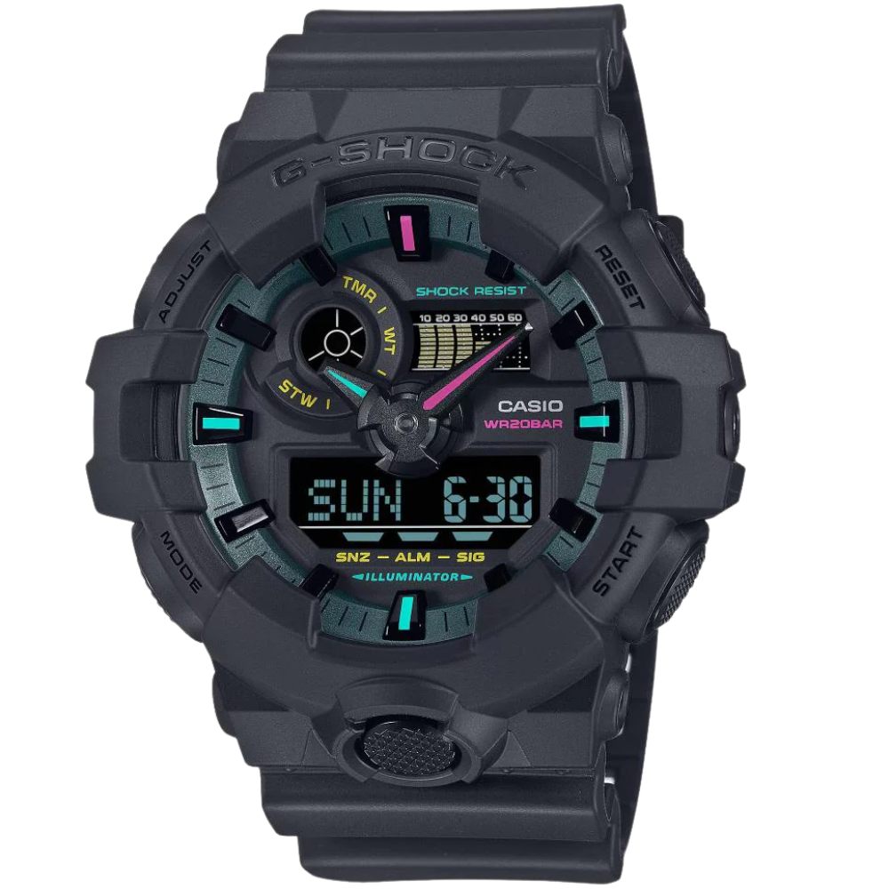 The Casio G-Shock GA-700MF-1ADR features a bold black design with analog-digital display, shock-resistant body, and durable resin construction. Its multifunction calendar, strong illumination, and rugged build make it ideal for sports and outdoor use. A 53 mm case and mineral glass ensure long-lasting performance.