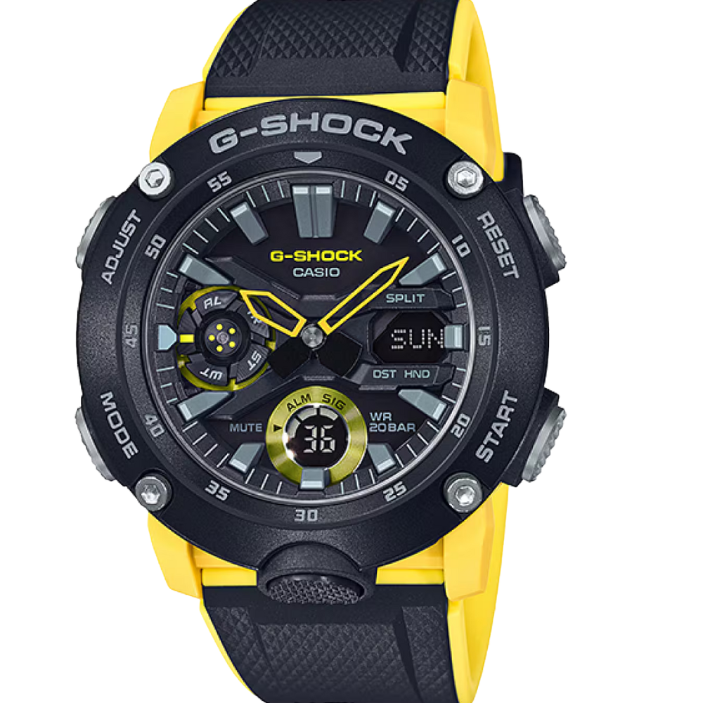 Casio G-Shock GA-2000-1A9DR analog-digital men’s watch with Carbon Core Guard, shock resistance, world time, timer, LED light, 200m water resistance, and a bold black-yellow design. Built for extreme durability.