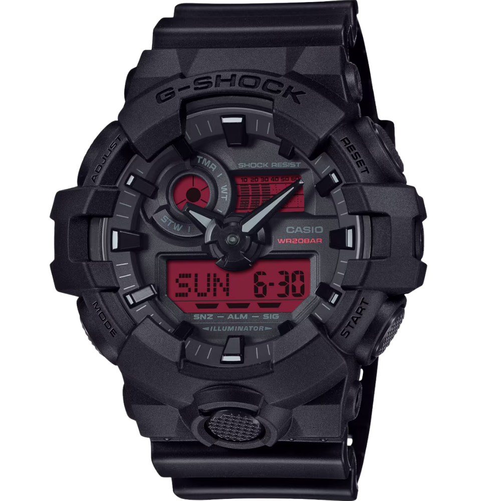This Casio G-Shock Black Resin Red Analog-Digital Watch features a bold, oversized design with shock resistance and 200m water resistance. With a durable resin band, mineral glass, and a long-lasting 5-year battery, it’s built for adventure. The red accents deliver a striking, sporty look.