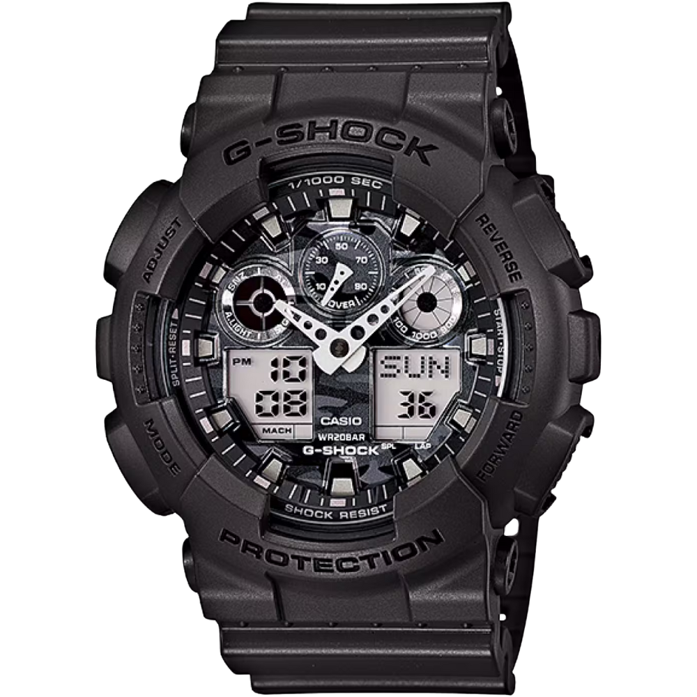 The G-Shock GA-100CF-1ACR features a rugged analog-digital display with a striking black camo dial. Built with a durable 51 mm resin case, mineral glass, quartz movement, and 200m water resistance, it offers extreme durability, shock resistance, and multifunction performance for outdoor and everyday use.