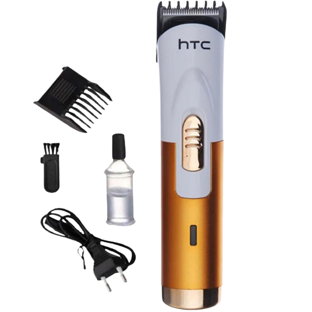 HTC AT-518B rechargeable hair and beard trimmer with 0.5–10 mm trimming range, 8 hour charging, 55 minute runtime, chromium steel blade, fiber body and 1 month motor service warranty – perfect for daily grooming at home.