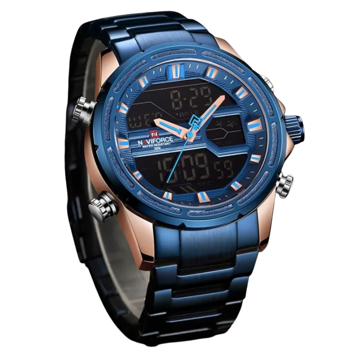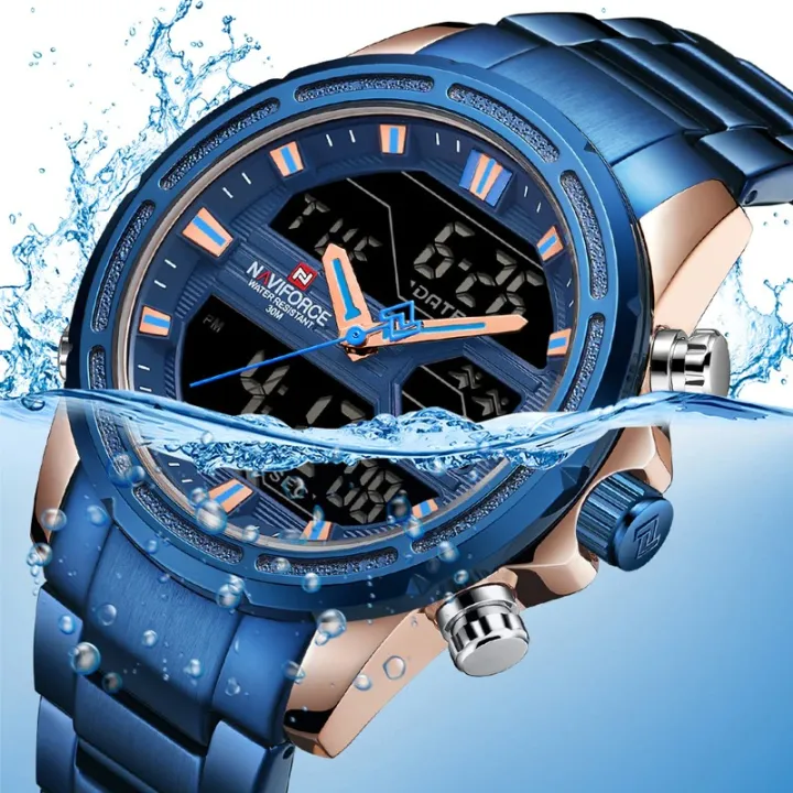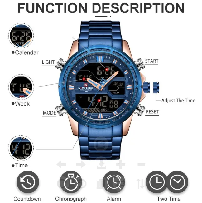 Shop NAVIFORCE NF9138 men’s sport watch with 45mm stainless steel case, dual display quartz movement, full calendar, stopwatch, alarm, backlight, and 3Bar water resistance.