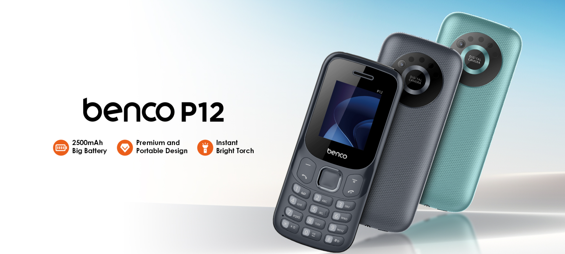 Benco P12 feature phone with 1.77-inch display, Dual SIM, digital camera, wireless FM, Bluetooth, and a powerful 2500mAh battery for long-lasting backup.