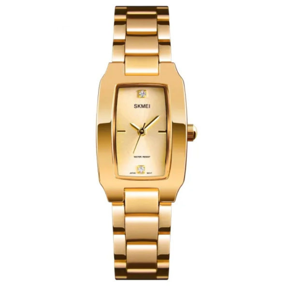 Shop the Skmei 1400GLD Women’s Quartz Watch — a stylish gold-tone stainless-steel timepiece with elegant oval design, precise movement, and 30M water resistance.