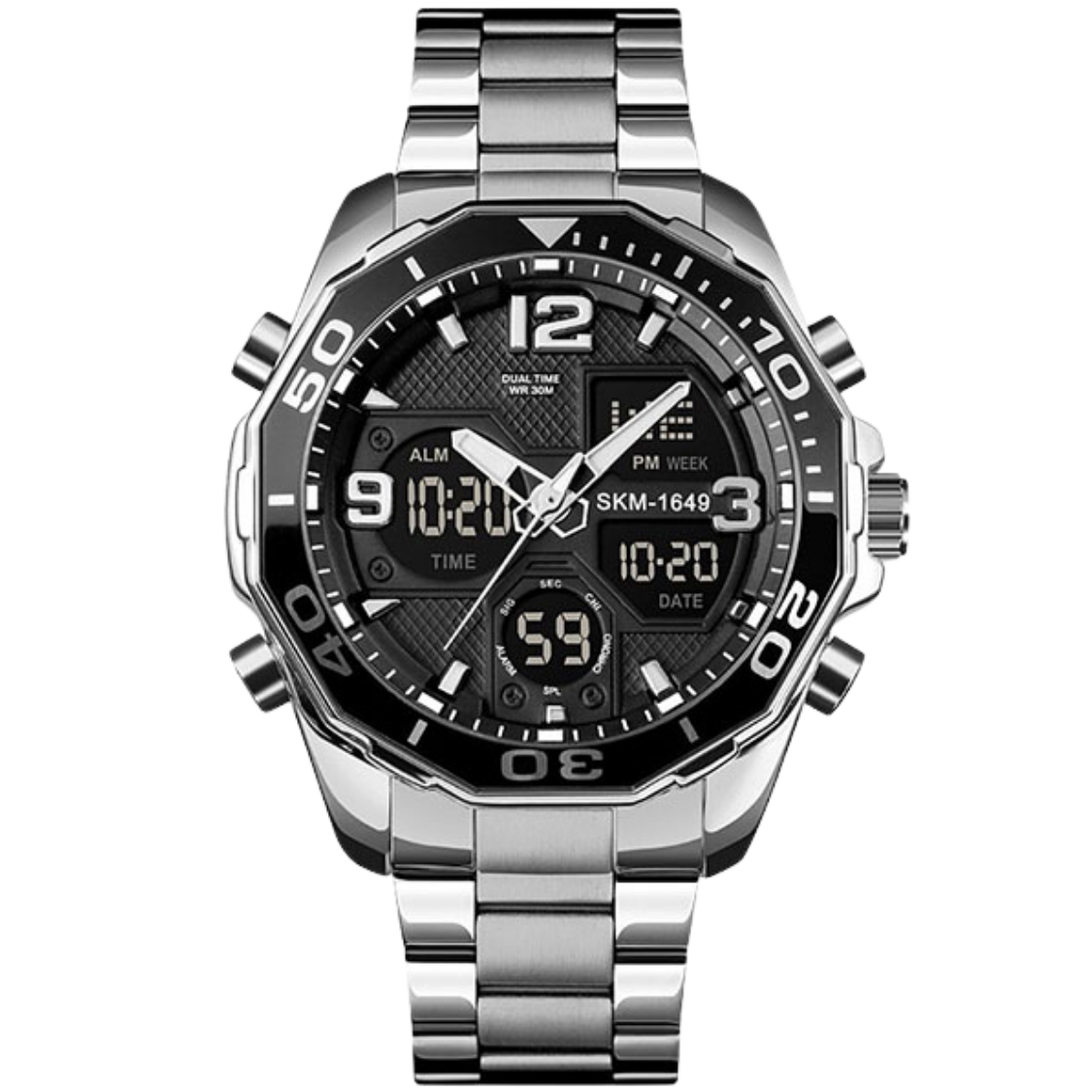 This digital sports watch features a bold 48mm dial, stainless steel strap, and durable alloy case. Designed for fashion and casual wear, it includes stopwatch, alarm, week display, luminous screen, shock resistance, and water resistance—making it a reliable and stylish everyday companion.