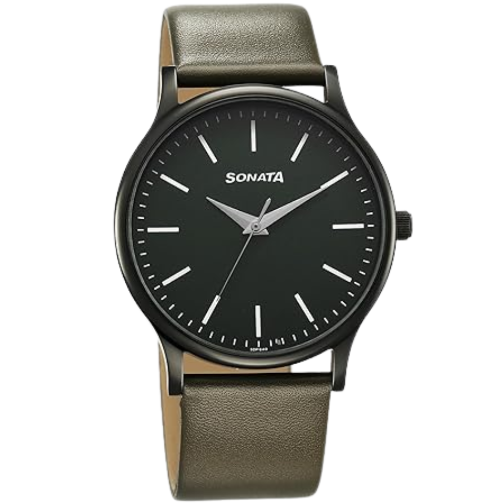 Sonata Aspire 77105NL10 men’s watch with green dial, matching leather strap, 48.9 mm brass case, mineral glass, sliding clasp, and quartz movement. A bold and stylish daily wear timepiece.