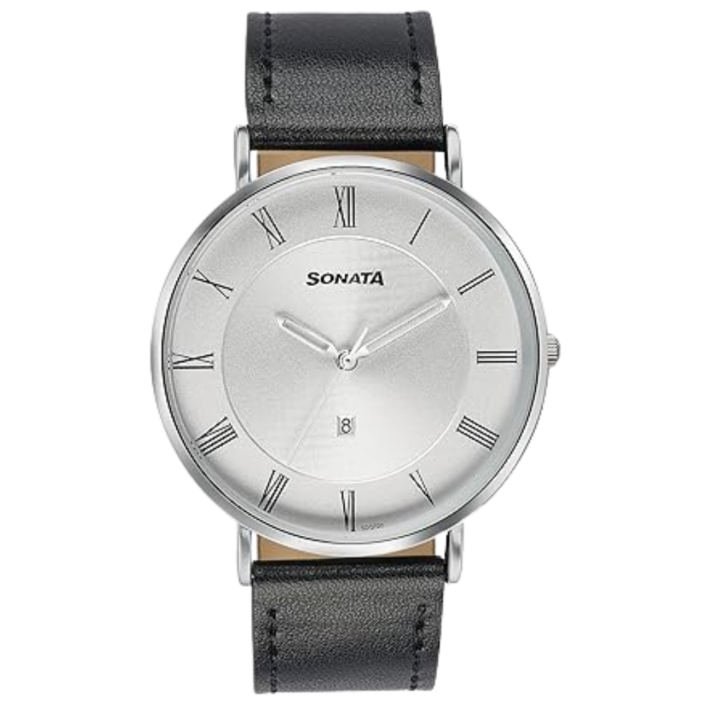 The Sonata 77142SL01 features a refined silver dial with a black leather strap, offering a premium classic look. Its 47.5 mm alloy-steel case, date display, mineral glass, and lightweight design make it ideal for daily wear, combining functionality with timeless sophistication for modern men.