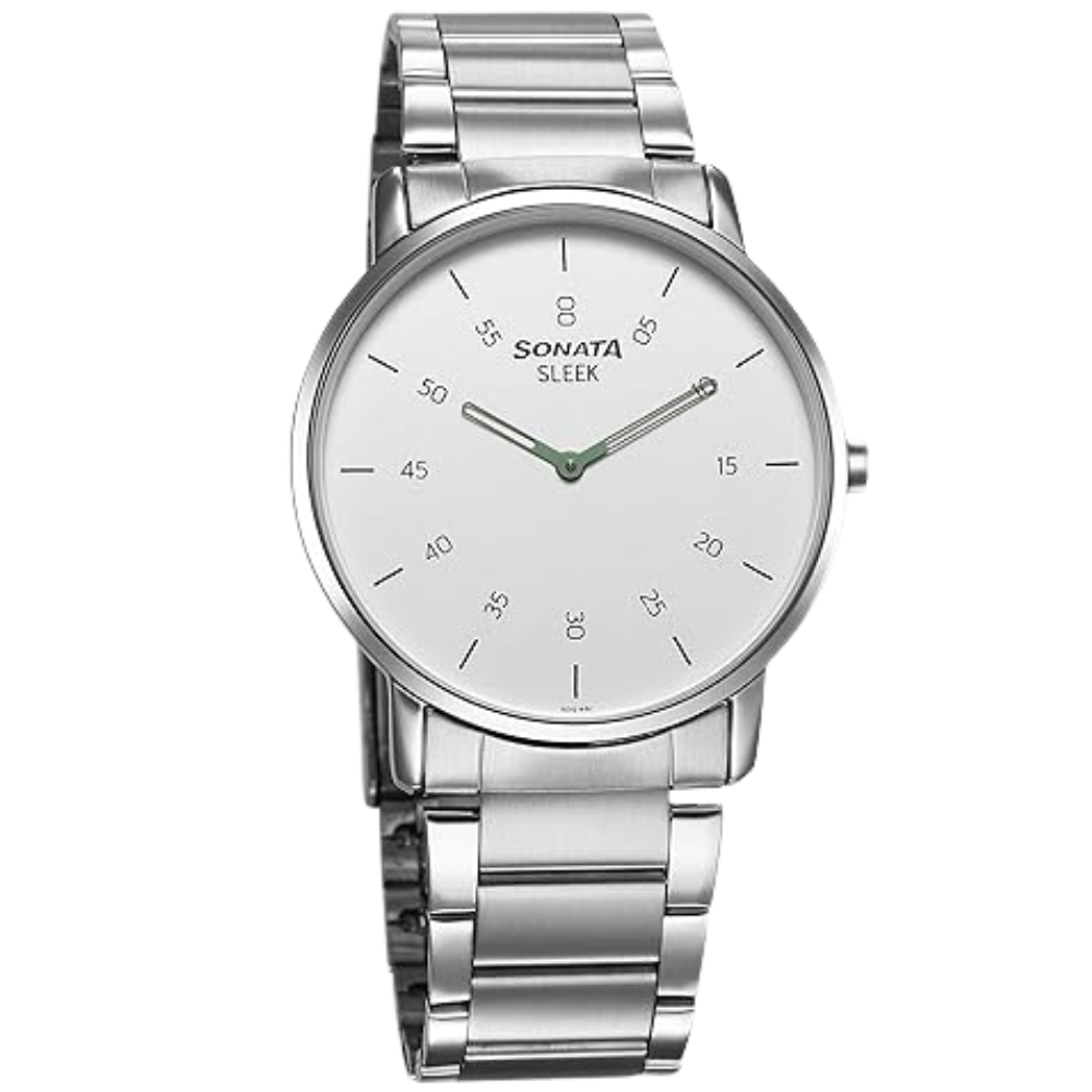 The Sonata Sleek 7152SM01 is a refined men’s analog watch featuring a clean white dial and a polished stainless steel strap. With its ultra-slim 6.05 mm brass case, mineral glass, and premium build, this stylish timepiece offers comfort, durability, and modern sophistication for any occasion.